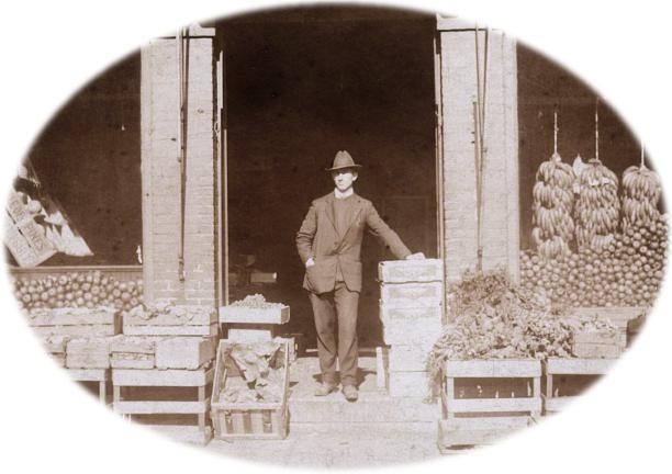 This photograph of Albert George Lenhardt in front of his produce store was made in the early 1920s. The store was in the 600 block of East Broadway, Alton, Illinois.
