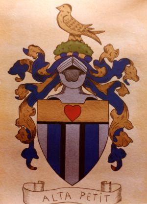 The shield is divided by perpendicular lines into seven parts of silver, black and blue. On top, a gold field changed with a red human heart. The crest is a martlet (a bird without feet indicating a fourth son) with the wings folded standing on a green hill. The motto is Latin: To aim at higher things.