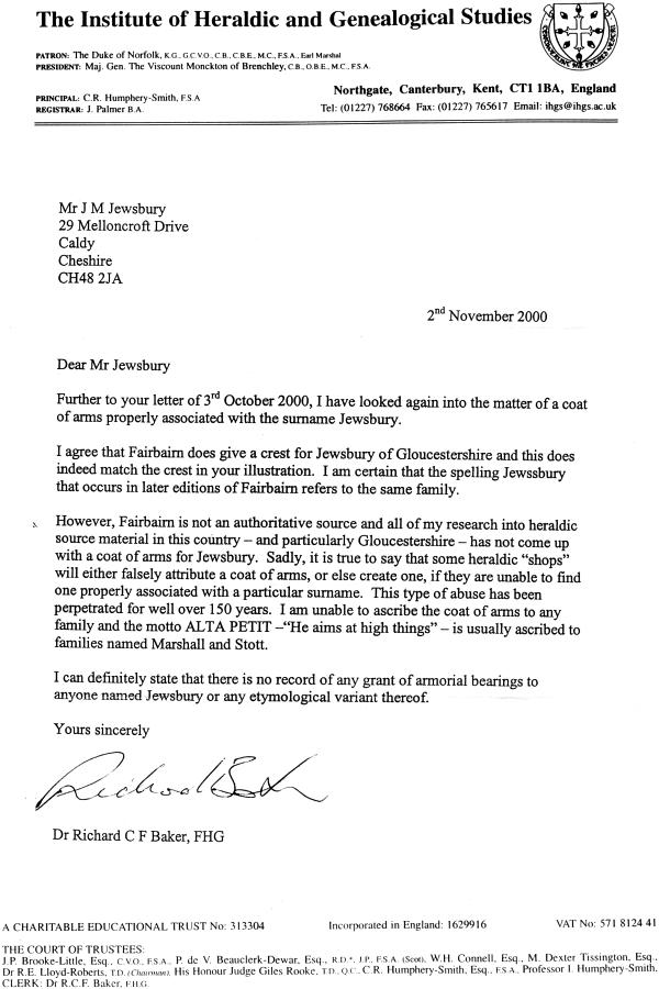 The Jewsbury family was seated in Gloucester, England, possessing extensive land holdings. The crest is on record in Fairbairn's Crests of the Leading Families of Great Britain and Ireland. However, be advised that the gentlemen of The Institute of Heraldic and Genealogical Studies in England believe this is a false attribution [scanned letter].